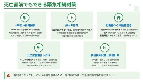 中小企業の相続対策10選死亡直前でもできる緊急相続対策 公開日: 2025.11.09 最終更新日: 2025.11.09 こちらの画像は、下記の記事で詳しく解説しています↓ 【税理士監修】中小企業の相続対策10選|生前贈与加算7年ルールと自社株・孫贈与対策 LINE友達に追加