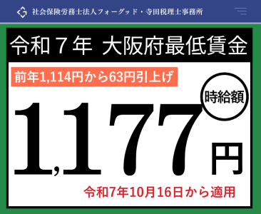 大阪府最低賃金2025年(令和7年) 公開日: 2025.08.25 最終更新日: 2025.08.25 こちらの画像は、下記の記事で詳しく解説しています↓ 2025年(令和7年)|大阪府最低賃金は1,177円!10月16日適用 LINE友達に追加