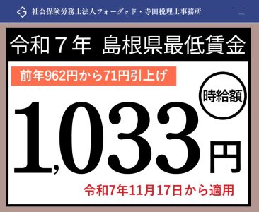 島根県最低賃金2025年(令和7年) 公開日: 2025.08.24 最終更新日: 2025.08.24 こちらの画像は、下記の記事で詳しく解説しています↓ 2025年(令和7年)島根県最低賃金は1,033円へ!11月17日適用 LINE友達に追加