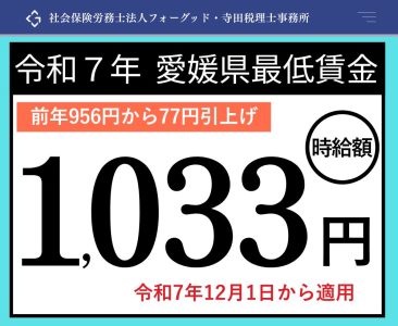 愛媛県最低賃金2025年(令和7年) 公開日: 2025.09.01 最終更新日: 2025.09.01 こちらの画像は、下記の記事で詳しく解説しています↓ 2025年(令和7年)愛媛県最低賃金は1,033円へ!12月1日適用 LINE友達に追加