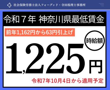 神奈川県最低賃金2025年(令和7年) 公開日: 2025.08.10 最終更新日: 2025.08.10 こちらの画像は、下記の記事で詳しく解説しています↓ 2025年(令和7年)神奈川県最低賃金は1,225円へ!10月4日適用 LINE友達に追加