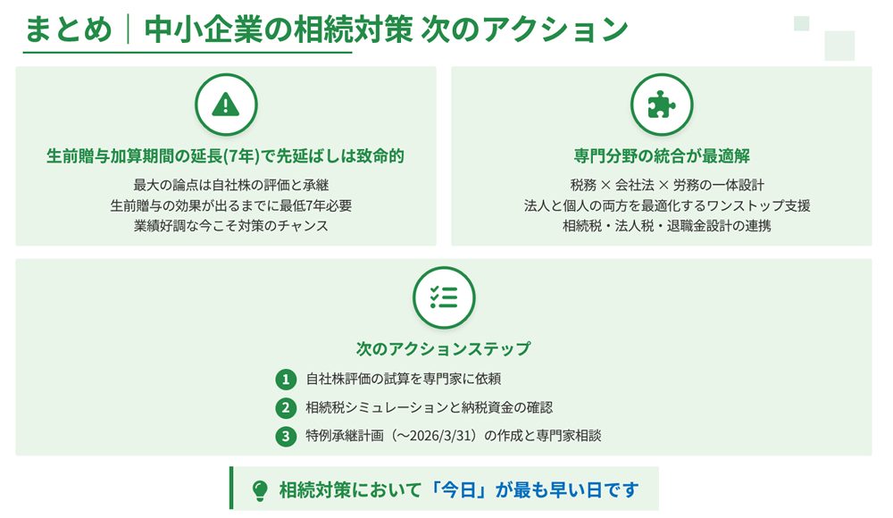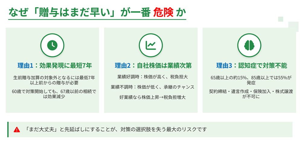 “text”: “「今日」が最も早い日です。2024年の生前贈与加算期間7年への改正により、生前贈与の効果が出るまでに最低7年かかります。さらに、認知症や急病のリスクを考えると、元気なうちに早めに着手することが最も重要です。特に中小企業オーナーの場合、自社株の評価対策には数年単位の時間が必要ですので、60歳を目安に具体的な対策を始めることをおすすめします。”
