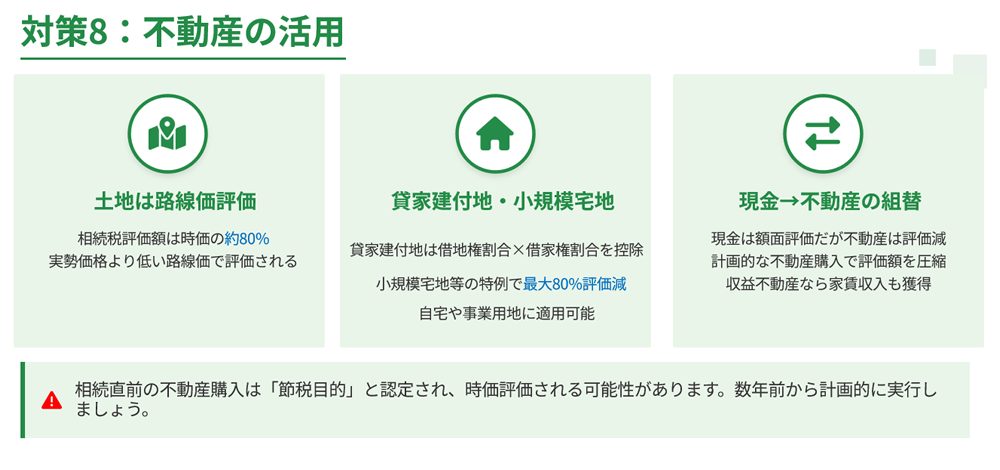 - 不動産の購入:現金を不動産に組み替え、評価額を圧縮
