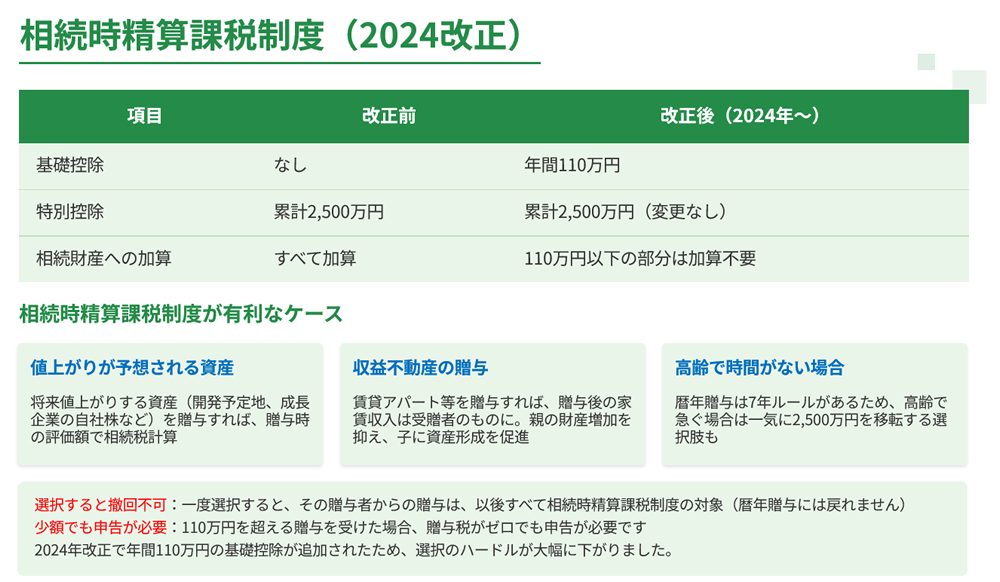 2024年改正により、年間110万円の基礎控除が新設されました。これにより、相続時精算課税制度がより使いやすくなっています。詳細は後述します。