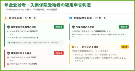 確定申告が必要な人・不要な人|年金受給者・失業保険受給者の確定申告判定(3パターン) 公開日: 2025.12.07 最終更新日: 2025.12.07 こちらの画像は、下記の記事で詳しく解説しています↓ 確定申告が必要な人・不要な人【2026年版】25パターン判定フローチャート LINE友達に追加