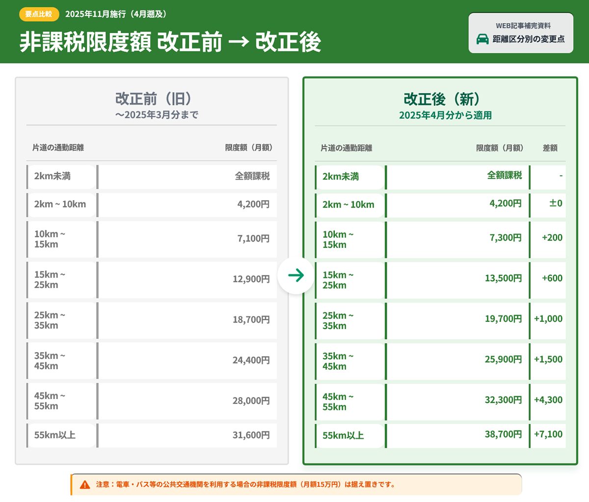 | 片道の通勤距離 | 改正前(旧) | 改正後(新) | 差額(非課税枠拡大) |