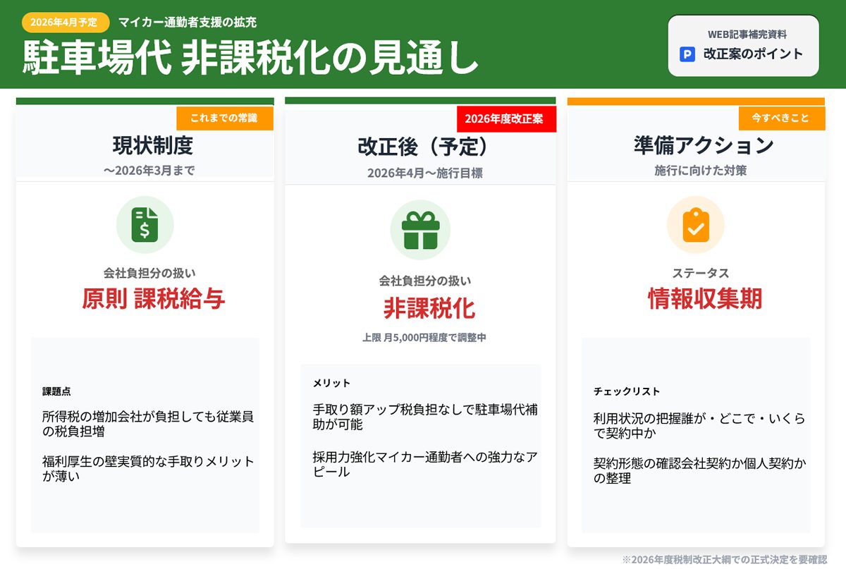 2025年の改正に続き、2026年4月からは「駐車場代の非課税化」が検討されています。