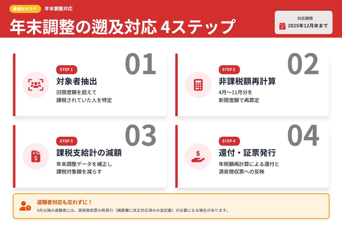 - 年末調整の遡及対応準備:対象者の洗い出しとシステム設定の確認を最優先で行う
