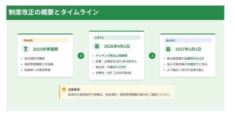 確定拠出年金制度改正2026-2027スケジュール 公開日: 2025.10.26 最終更新日: 2025.10.26 こちらの画像は、下記の記事で詳しく解説しています↓ 確定拠出年金制度改正2026-2027完全ガイド|iDeCoよりマッチング拠出へ LINE友達に追加