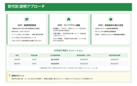 確定拠出年金制度改正世代別説明アプローチ 公開日: 2025.10.26 最終更新日: 2025.10.26 こちらの画像は、下記の記事で詳しく解説しています↓ 確定拠出年金制度改正2026-2027完全ガイド|iDeCoよりマッチング拠出へ LINE友達に追加