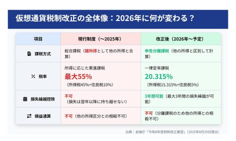 【2026年最新】 仮想通貨税制改正何が変わる? 公開日: 2025.11.01 最終更新日: 2025.11.01 こちらの画像は、下記の記事で詳しく解説しています↓ 2026年改正|仮想通貨の税率が55%→20%に!投資家への影響を解説 LINE友達に追加