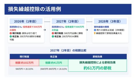 仮想通貨税制改正|損失繰越控除の活用例 公開日: 2025.11.01 最終更新日: 2025.11.01 こちらの画像は、下記の記事で詳しく解説しています↓ 2026年改正|仮想通貨の税率が55%→20%に!投資家への影響を解説 LINE友達に追加
