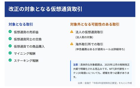 仮想通貨税制改正の対象となる仮想通貨取引 公開日: 2025.11.01 最終更新日: 2025.11.01 こちらの画像は、下記の記事で詳しく解説しています↓ 2026年改正|仮想通貨の税率が55%→20%に!投資家への影響を解説 LINE友達に追加