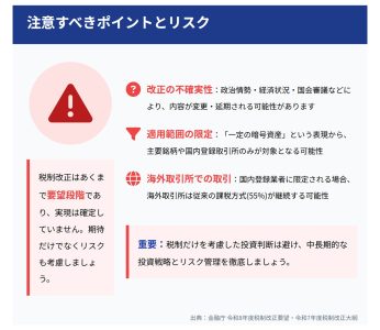 仮想通貨税制改正|注意ポイントとリスク 公開日: 2025.11.01 最終更新日: 2025.11.01 こちらの画像は、下記の記事で詳しく解説しています↓ 2026年改正|仮想通貨の税率が55%→20%に!投資家への影響を解説 LINE友達に追加