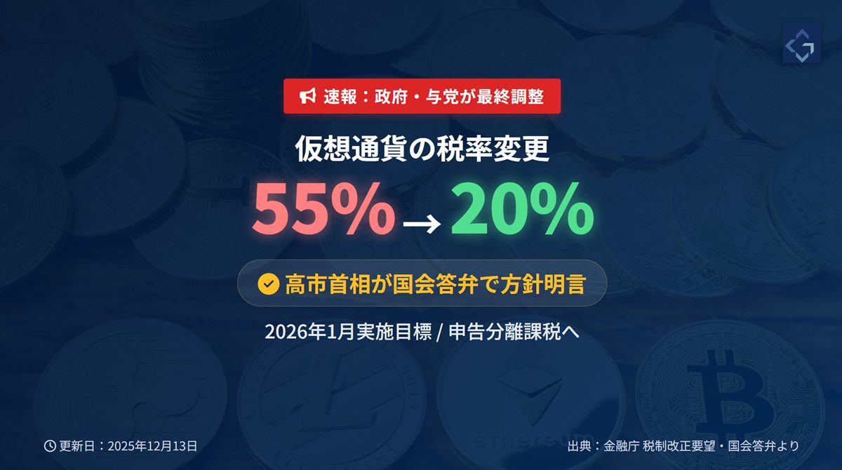 2026年から仮想通貨(暗号資産)の税制が大幅に変更される見通しです。政府・与党が申告分離課税導入で最終調整に入り、現在の最大55%という重い税負担から、株式投資と同じ20.315%への引き下げが確実視されています。
