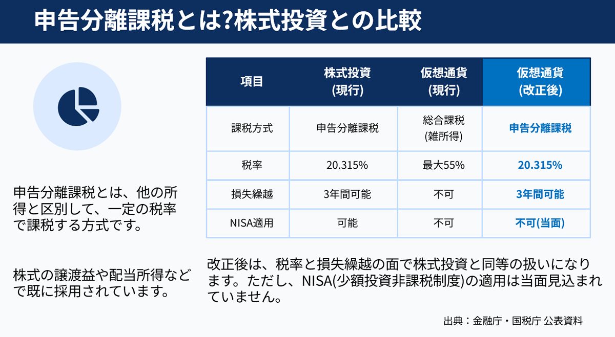 - 課税方式:雑所得(総合課税) → 申告分離課税(株式と同じ)