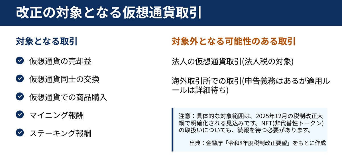 A: 国内交換業者が扱う105銘柄から政令で対象を選定する予定です。ビットコイン、イーサリアム等の主要銘柄は対象となる見込みです。