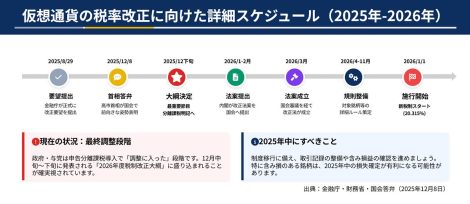 【2026年改正】仮想通貨の税率が55%→20%へ|改正に向けた詳細スケジュール 公開日: 2025.12.13 最終更新日: 2025.12.13 こちらの画像は、下記の記事で詳しく解説しています↓ 【2026年改正】仮想通貨の税率が55%→20%に!投資家への影響を解説 LINE友達に追加