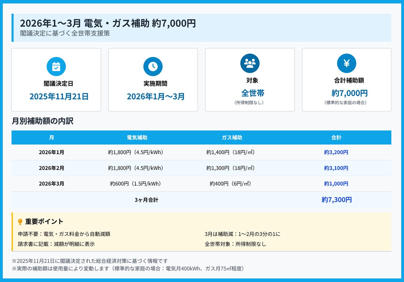 2026年1月から3月にかけて実施される電気・ガス補助は、全世帯を対象に約7,000円の負担軽減を実現します。
