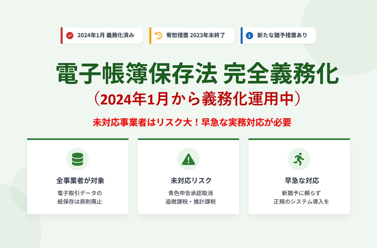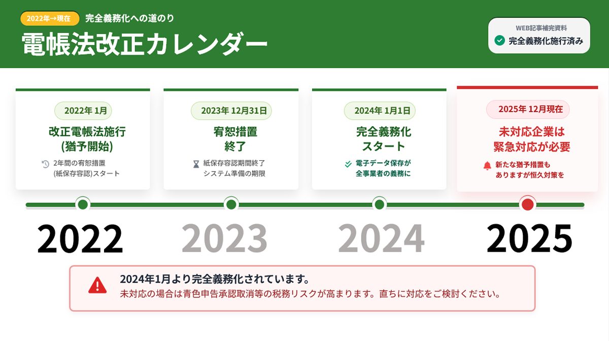 | 2024年1月1日 | 完全義務化開始 (電子保存運用必須) 新たな猶予措置も開始 |