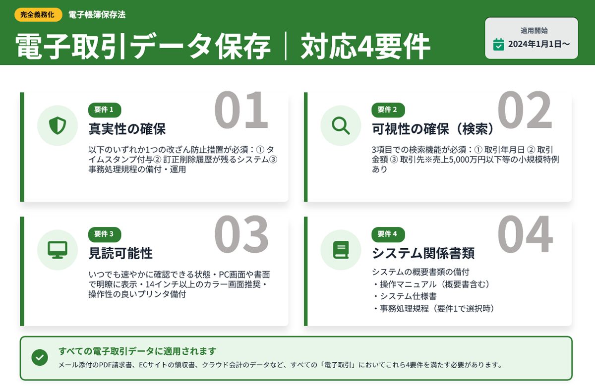 | 電子取引データ保存 | 完全義務(2024年1月~義務化済み) |