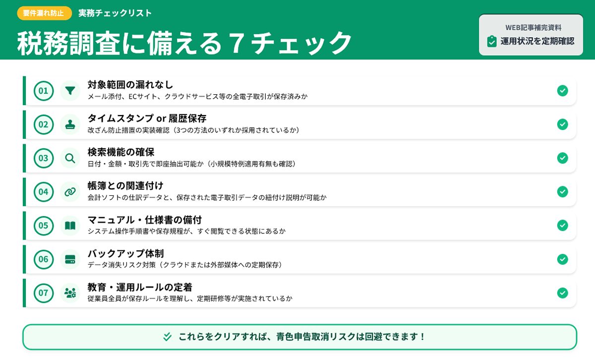 - 未対応の場合、青色申告承認取消・追徴課税のリスクあり