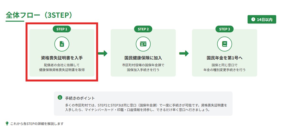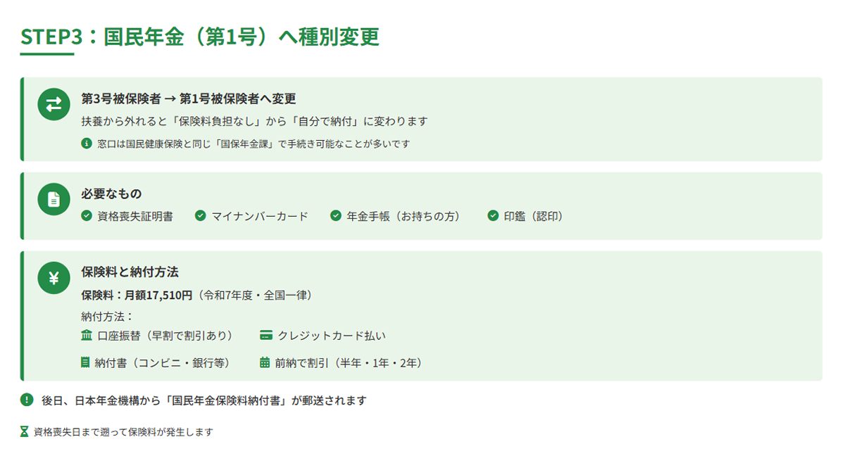 | 必要な手続き | ①国民健康保険への加入 ②国民年金の種別変更(第3号→第1号) |