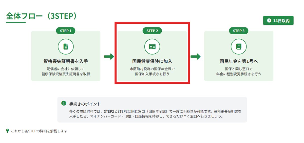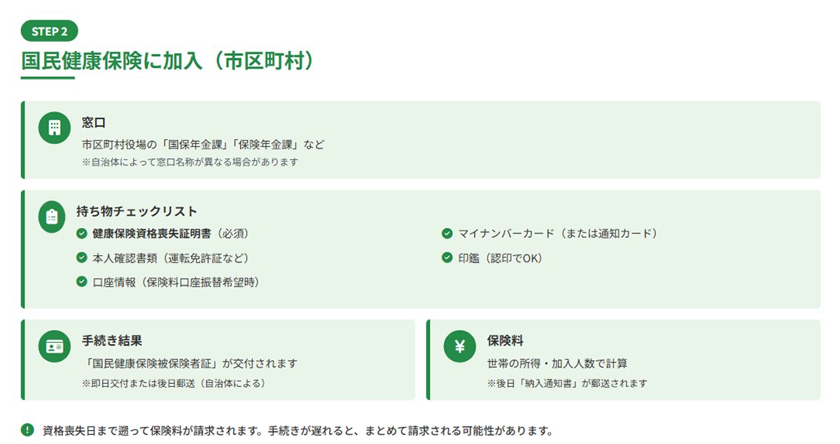 - STEP2:市区町村役場で「国民健康保険」に加入する
