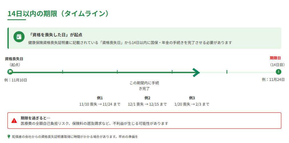 国民健康保険法および国民年金法では、「資格を失った日から14日以内」に手続きを行うことが義務付けられています。