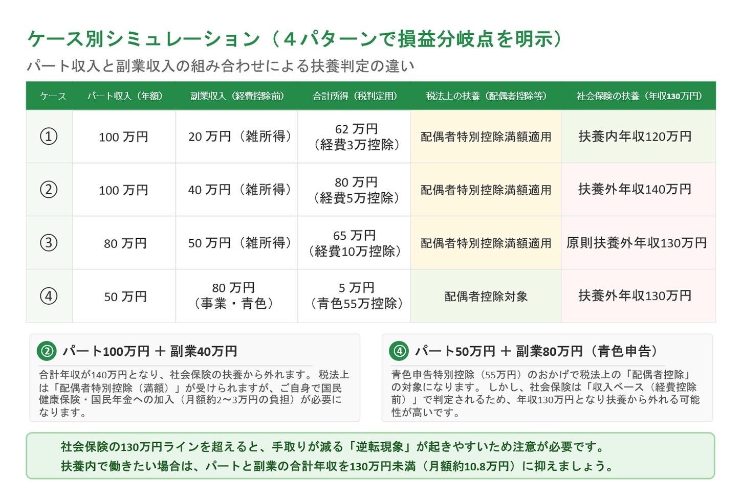 - ケース別シミュレーション(パート+副業の損益分岐点)