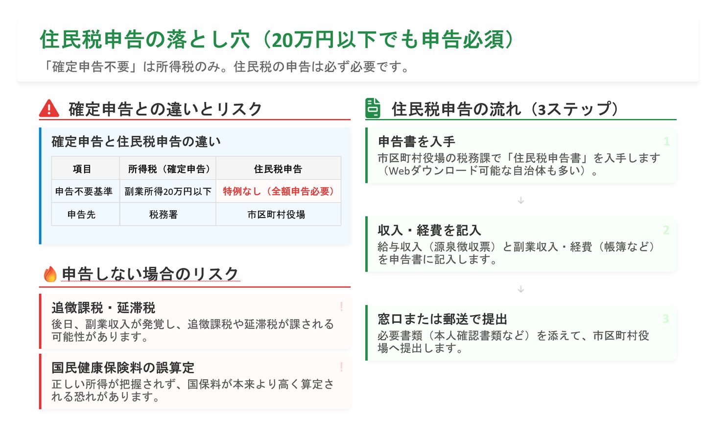 - 「副業20万円以下は申告不要」は所得税のみの話。住民税は必ず申告が必要です。