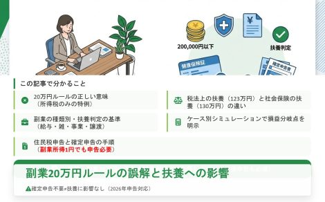 副業と扶養の関係【2026年版】20万円申告不要ルールの誤解と正しい判定基準概要 公開日: 2025.11.29 最終更新日: 2025.11.29 こちらの画像は、下記の記事で詳しく解説しています↓ 副業と扶養の関係【2026年版】20万円申告不要ルールの誤解と正しい判定基準 LINE友達に追加