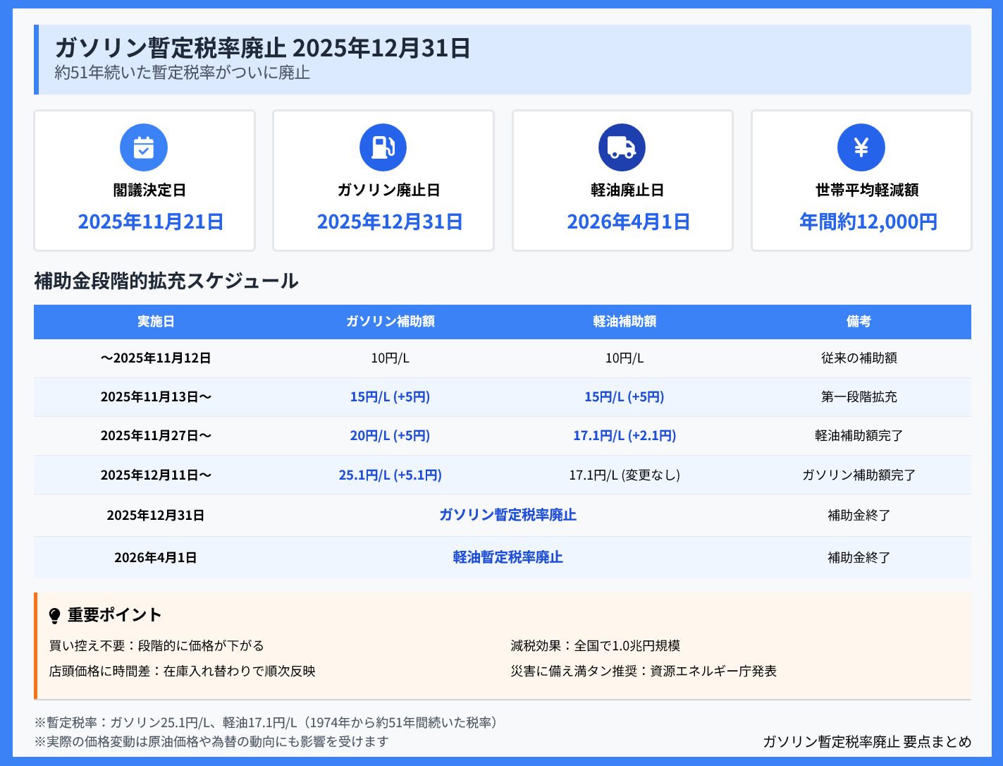 - ガソリン暫定税率は2025年12月31日に廃止(閣議決定:11月21日)