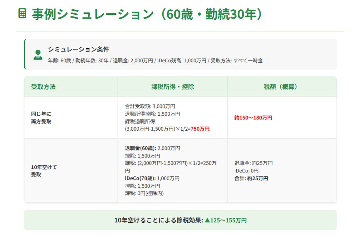 先ほどの例(勤続30年、退職金受取後3年でiDeCo受取)の場合: