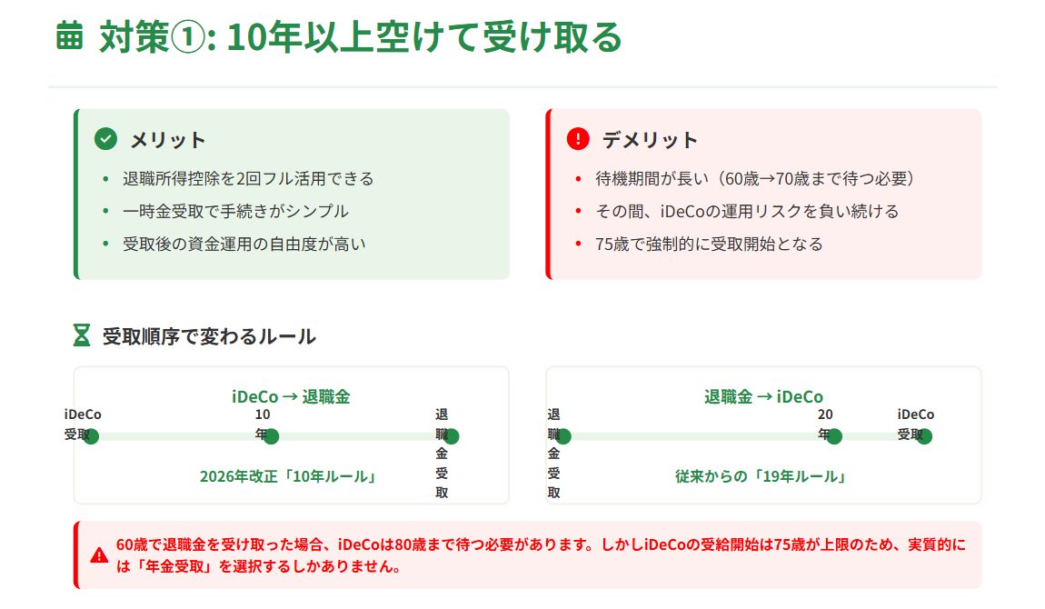- 10年以上空けて受け取る(ただし受取順序に注意:iDeCo→退職金なら10年、退職金→iDeCoなら20年必要)