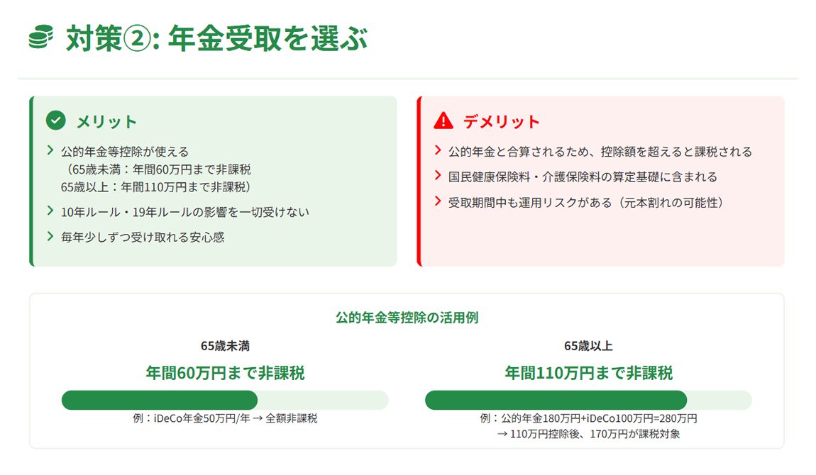 - 年金受取のデメリット:公的年金と合算されるため、控除額を超えると課税される。社会保険料も増加