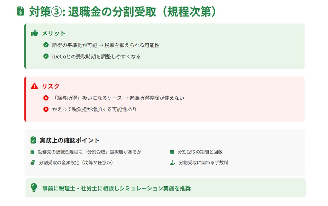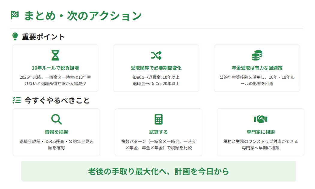 「一時金×一時金(10年空ける)」「一時金×年金」「年金×年金」など、複数パターンをシミュレーションしてください。 - 専門家(税理士・社労士)に相談する