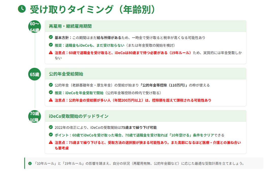 - 受取順序でルールが異なる:「iDeCo先→退職金後」は10年空ける、「退職金先→iDeCo後」は20年空ける(19年ルール)