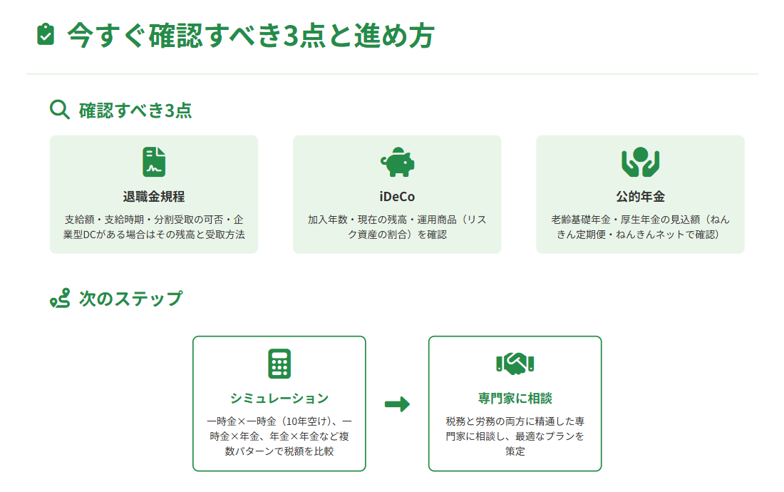 - 勤務先の退職金規程、iDeCo残高、公的年金見込額を確認
