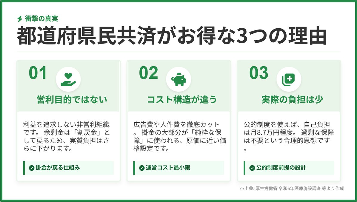 - 都道府県民共済の優位性:非営利の共済は、民間保険より大幅に安い保険料で同等の保障を提供