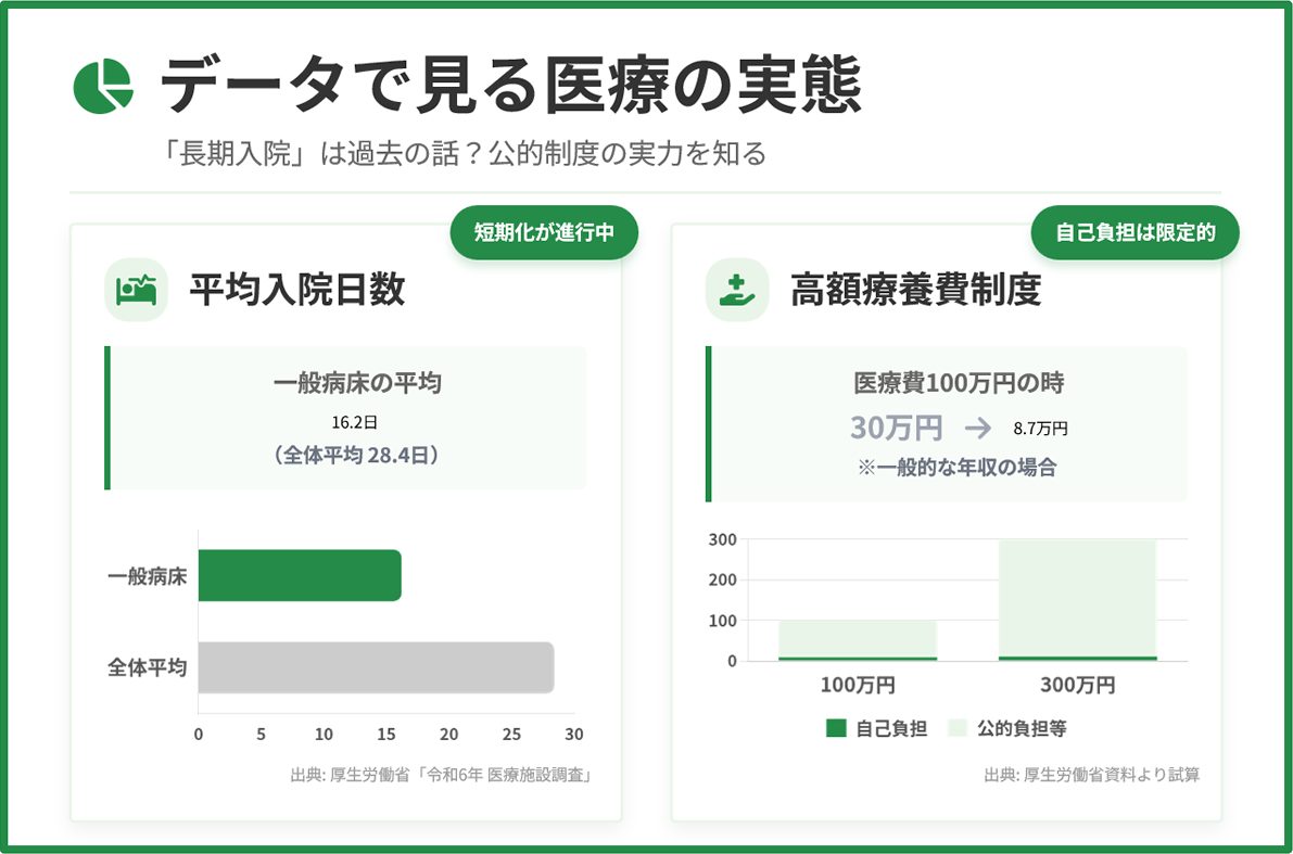 平均入院日数や病床数などの最新統計データ。「本当に長期の医療保険が必要か?」を判断する際の客観的な根拠として活用できます。