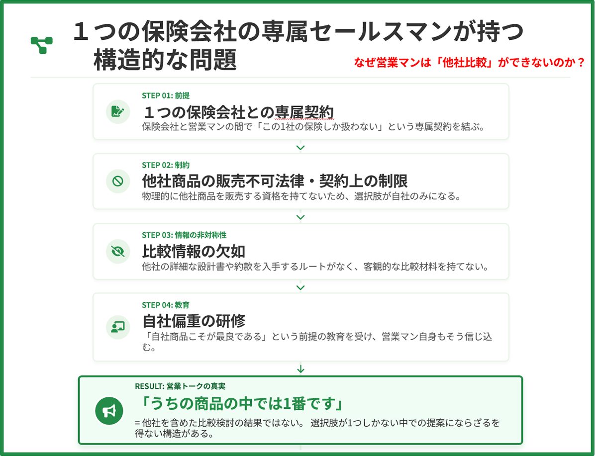 - 一社専属システムの限界:営業マンは構造的に他社商品を知らず、比較もできない