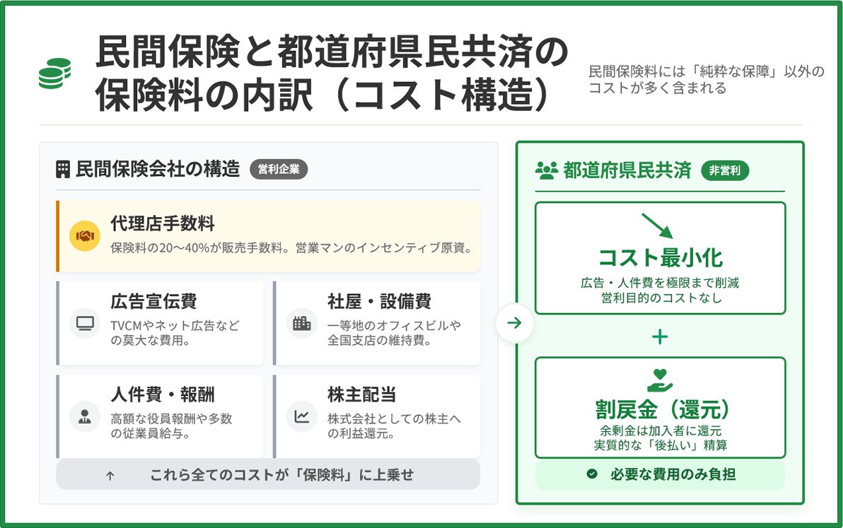 - コスト構造が違う:民間保険には多額の広告費、高額な役員報酬、豪華な社屋の維持費が保険料に含まれている