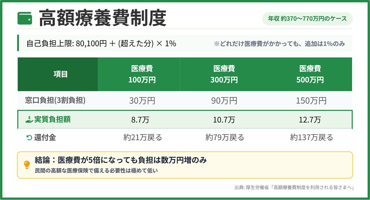 - 実際の医療費負担は少ない:高額療養費制度により、入院しても自己負担は月額約8.7万円(医療費100万円の場合)程度