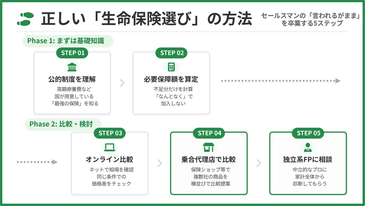 - 正しい選び方:複数社比較、公的制度の理解、自分での勉強が不可欠