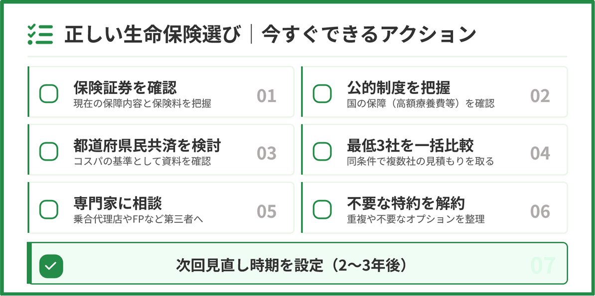- 🔍 商品を比較する:保険料、保障内容、特約の必要性を吟味