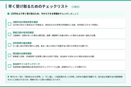 児童手当2万円上乗せ|チェックリスト 公開日: 2025.11.20 最終更新日: 2025.11.20 こちらの画像は、下記の記事で詳しく解説しています↓ 児童手当上乗せ2万円、いつ振り込まれる?全国自治体別支給スケジュール完全ガイド LINE友達に追加