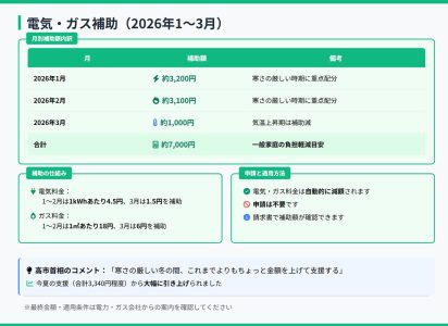 電気・ガス補助(2026年1月から3月) 公開日: 2025.11.21 最終更新日: 2025.11.21 こちらの画像は、下記の記事で詳しく解説しています↓ 【速報】児童手当2万円給付が正式決定!2025年11月閣議決定の最新情報 LINE友達に追加