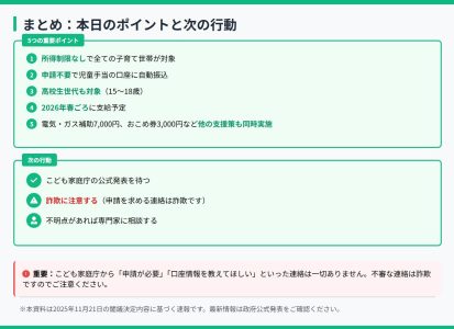 児童手当2万円上乗せ閣議決定|まとめ 公開日: 2025.11.21 最終更新日: 2025.11.21 こちらの画像は、下記の記事で詳しく解説しています↓ 【速報】児童手当2万円給付が正式決定!2025年11月閣議決定の最新情報 LINE友達に追加