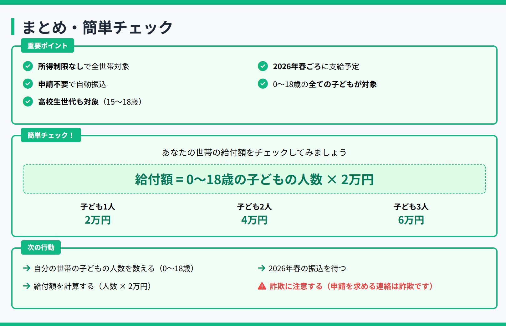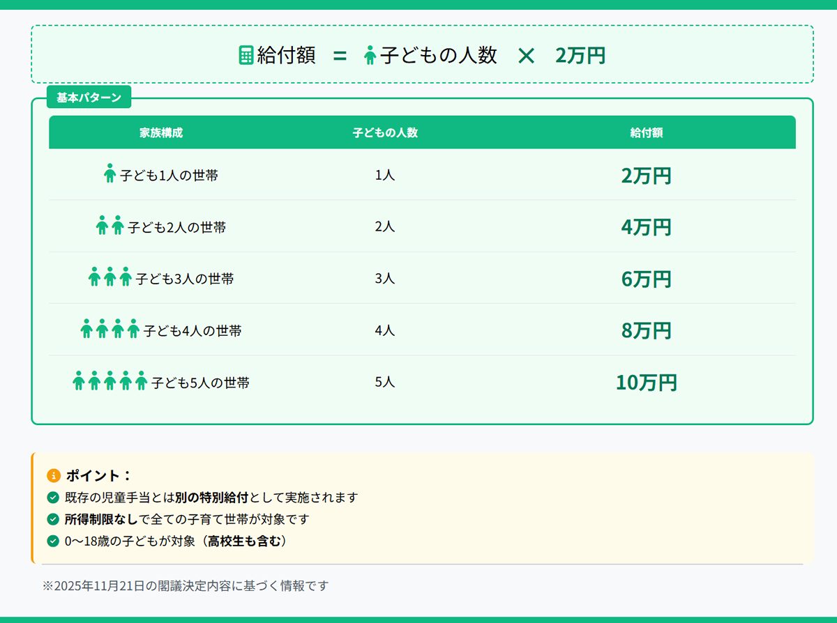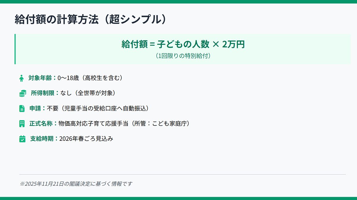 - 給付額は子どもの人数 × 2万円のシンプルな計算